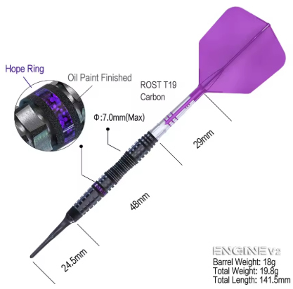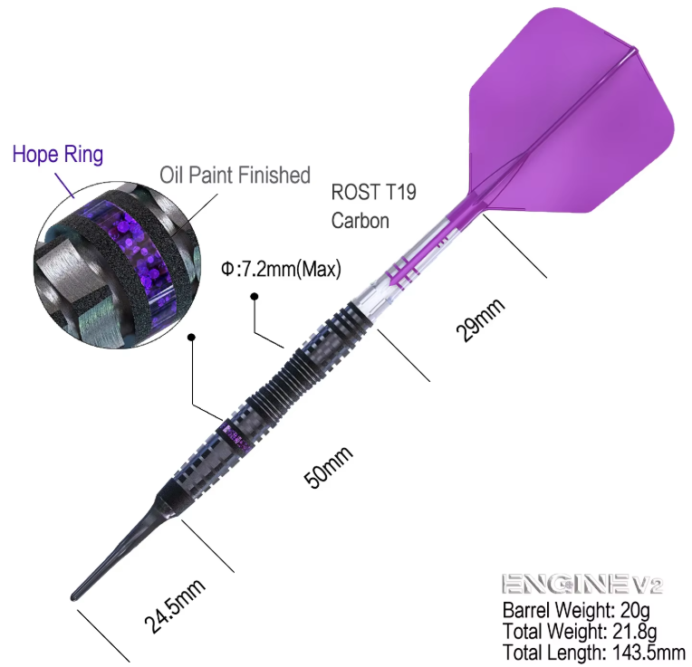 3 fléchettes 90% Tungsten 18g ou 20g avec finition peinture à l'huile, offre un Super Grip, décoré d'un anneau Purple Hope