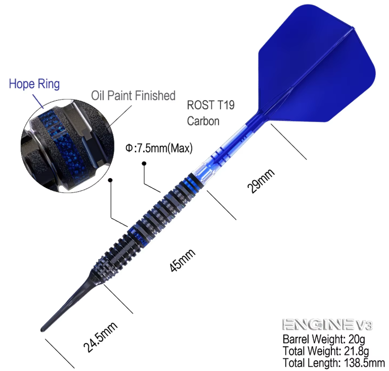 3 fléchettes 90% Tungsten 18g ou 20g avec finition peinture à l'huile, offre un Super Grip, décoré d'un anneau Blue Hope