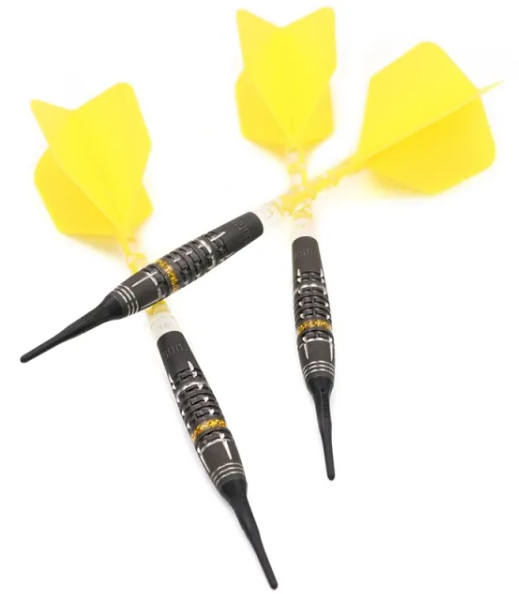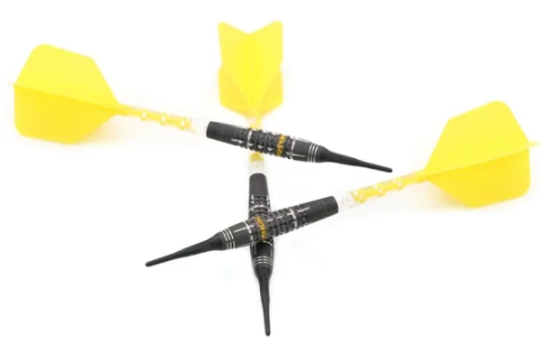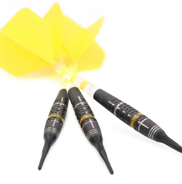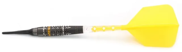 3 fléchettes 90% Tungsten 18g ou 20g avec un style "SPOKE", finition peinture à l'huile, offre un Super Grip, décoré d'un anneau Yellow Hope.
