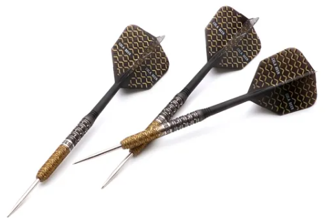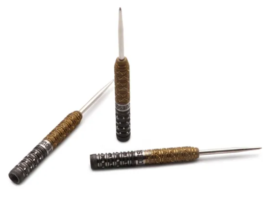 3 fléchettes 90% Tungsten 21g avec un style élégant, finition peinture à l'huile Gold/Gun Grey, offre un Super Grip.