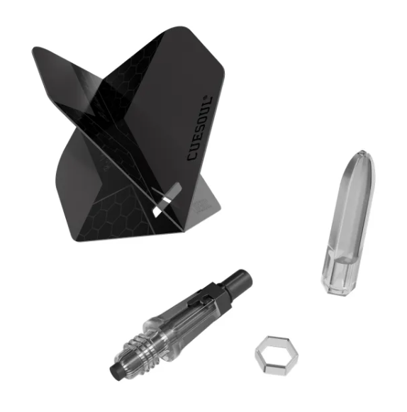 Le système de vol KOFF est une innovation par rapport aux ailettes pliables traditionnelles. Le manche est divisé en deux parties : l'avant est doté d'une tige en fibre de carbone robuste pour une rigidité et une durabilité accrues, tandis que l'arrière est remplaçable, car il est fréquemment endommagé par les pointes de fléchettes. La conception hexagonale unique du manche de la fléchette, contrairement à la forme ronde traditionnelle, permet un serrage facile sans glissement.